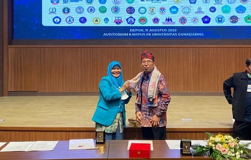 PP – Rektor Institut Teknologi Pertanian (ITP) Takalar Dr. Hj. Irma Andriani, S.Pi., M.Si mengalungkan kain siborita sebagai tanda mata kepada Wakil Rektor Universitas Gunadharma, Depok di sela-sela kunjungan penandatanganan Memorandum of Understanding (MoU) antara ITP Takalar dengan Universitas Gunadharma yang berlangsung di Kampus Gundam sebutan Universitas Gunadharma.