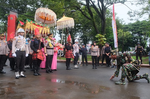 Kapolda Sulsel Irjen Pol Setyo Boedi Moempoeni beserta istri kemudian menyapa jajaran personil Polda Sulsel yang berdiri berjejer menyambutnya.