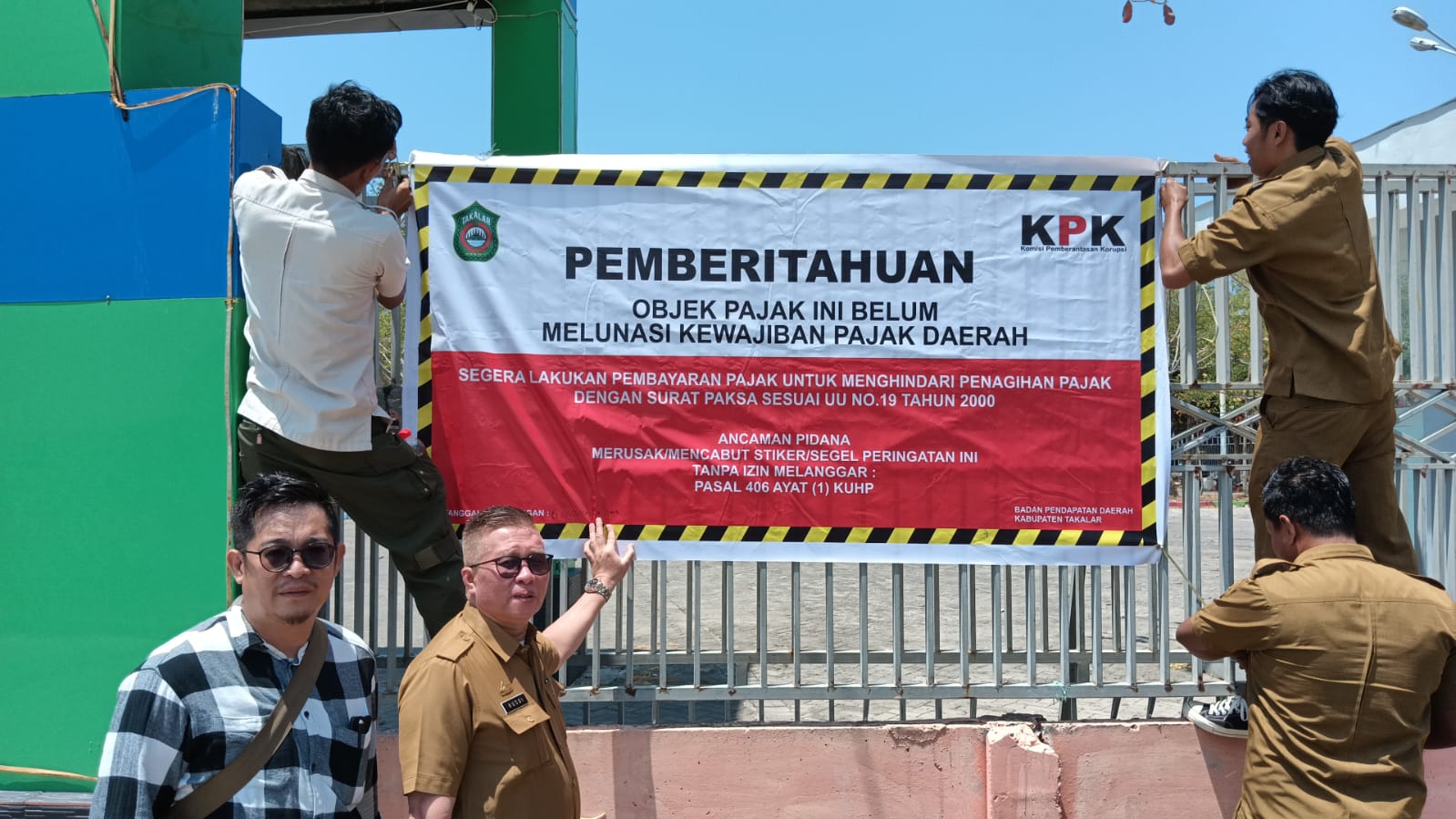 Teguran diberikan dengan memberikan stiker dan spanduk peringatan karena belum membayar pajak PBB-P2 yang telah jatuh tempo per 31 Oktober 2023 sebesar Rp 42.928.200.