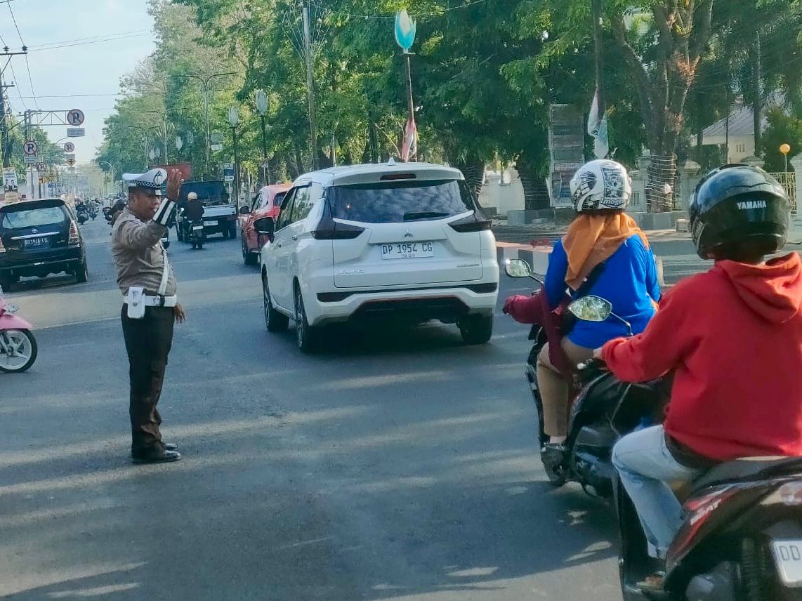 Pengaturan lalu lintas dilakukan secara manual, di mana petugas memberikan aba-aba kepada pengendara untuk memastikan setiap kendaraan bergerak dengan tertib dan aman.