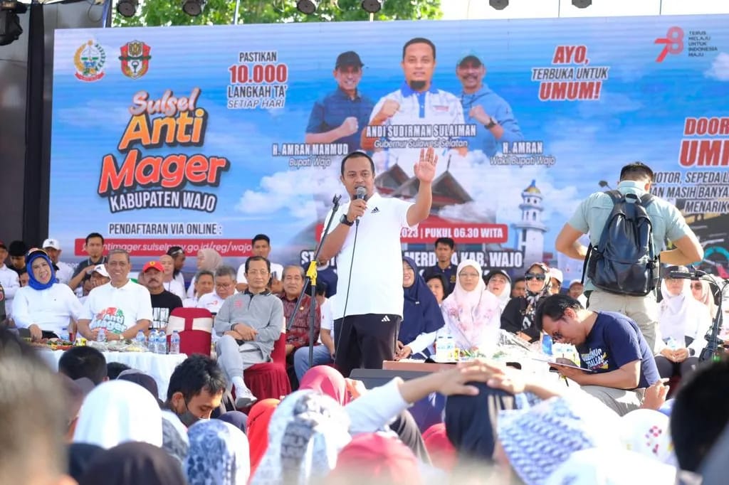 Pembaharuanpost.com.—Pj. Bupati Takalar Dr. Setiawan Aswad M.Dev., Plg. Bersama Pj. Ketua TP. PKK Kab. Takalar Sri Astuti Thamrin Setiawan S. Si, M. Stat, Ph.D Menghadiri Kegiatan Sulsel Anti Mager yang merupakan bagian dari rangkaian kegiatan Expo Dekranasda Sulsel Kreatif Andalan Tahun 2023 Tingkat Provinsi Sul-sel di Kabupaten Wajo.