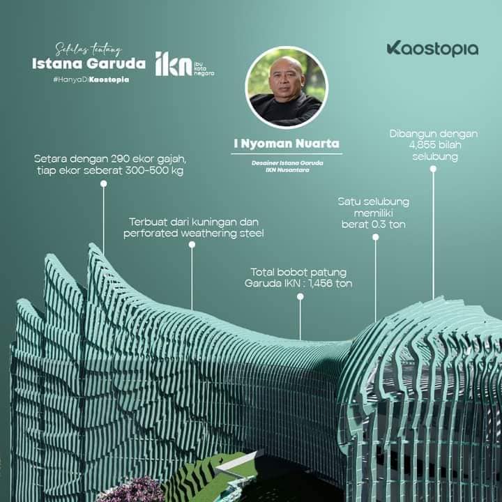 ISTANA GARUDA dibangun dengan 4,855 bilah selubung di mana satu selubung mempunyai berat 0.3 ton. Total berat keseluruhan patung Garuda IKN ini mencapai 1,456 ton atau setara 290 ekor gajah dengan tiap ekor mempunyai berat antara 300 hingga 500kg!!